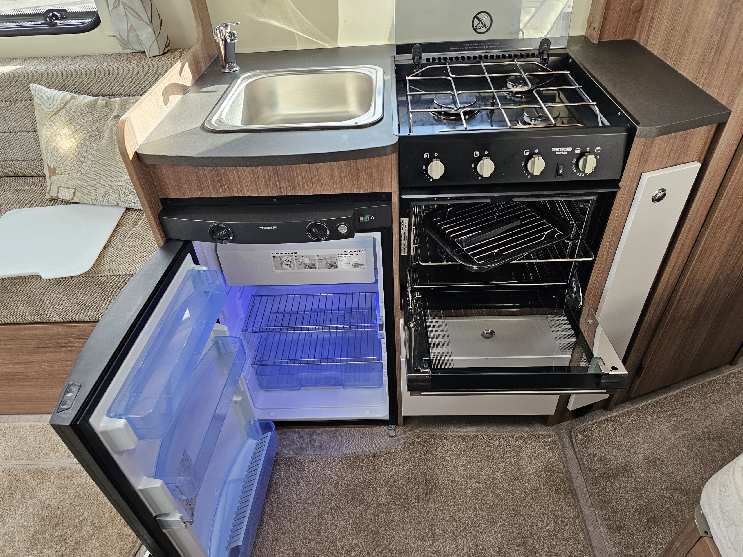 The kitchen area comes well equipped with a Full Cooker (Hob, Grill & Oven), Stainless Steel Sink, 3 Way Fridge with Freezer Compartment, Microwave and many storage cupboards. The rear bedroom comes with a large fixed bed a television stand, loads of storage with wardrobe, cupboards and overhead lockers, as well as underbed storage.