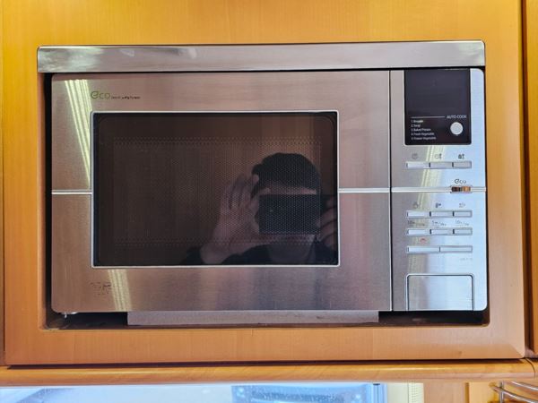 • Large L shaped kitchen comprising Corian worktops with integrated sink unit and draining board, Extendible mixer tap, Dometic hob with glass lid