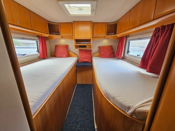The rear bedroom area can be completely closed off from the rest of this luxury Liner using a sliding door. It comprises of twin single beds with 12v lighting throughout and an access door into the garage.
