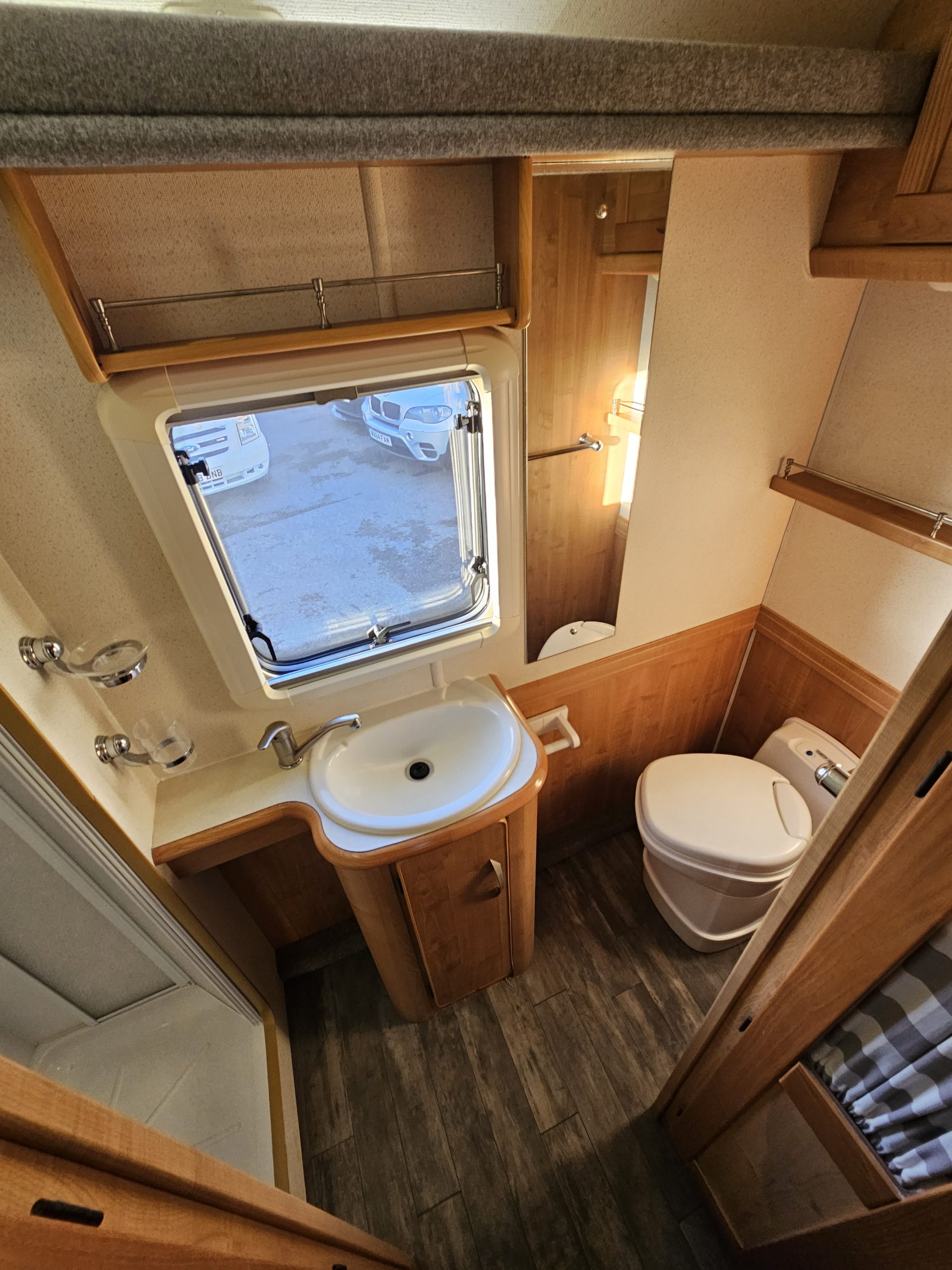 The en-suite rear shower room is huge and can also be used as a changing room as it comes with a wardrobe. It comes complete with a large separate shower cubicle with shower mixer and folding shower screen door, vanity unit with wash basin and mixer tap and a swivelling cassette toilet.